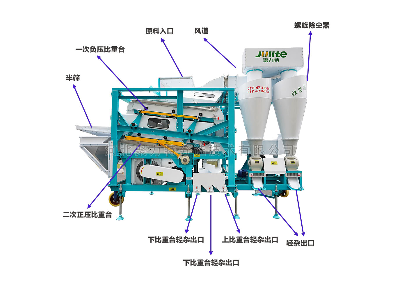 物料通過輸送設(shè)備經(jīng)喂入斗進(jìn)入第一道負(fù)壓比重臺,通過風(fēng)選去除物料中的粉塵、糠殼等輕雜質(zhì),輕雜經(jīng)風(fēng)道、螺旋除塵器,由閉風(fēng)器排出收集;通過比重選有效去除物料中的秸稈、軸塊等比重較輕的雜質(zhì)。后物料通過導(dǎo)糧機(jī)構(gòu)進(jìn)入第二道正壓比重臺,通過調(diào)整風(fēng)量、擋板位置等進(jìn)行比重加工,有效去除物料中的碎粒、秕籽、芽粒、蟲蛀粒、霉變粒等雜質(zhì)。最終成品從比重臺高處排出。