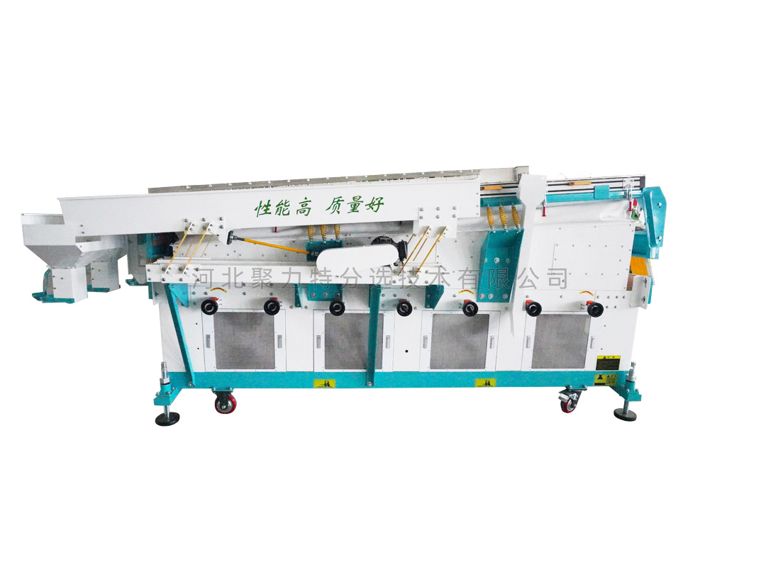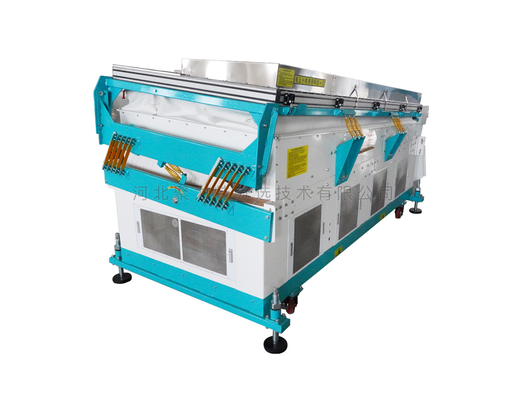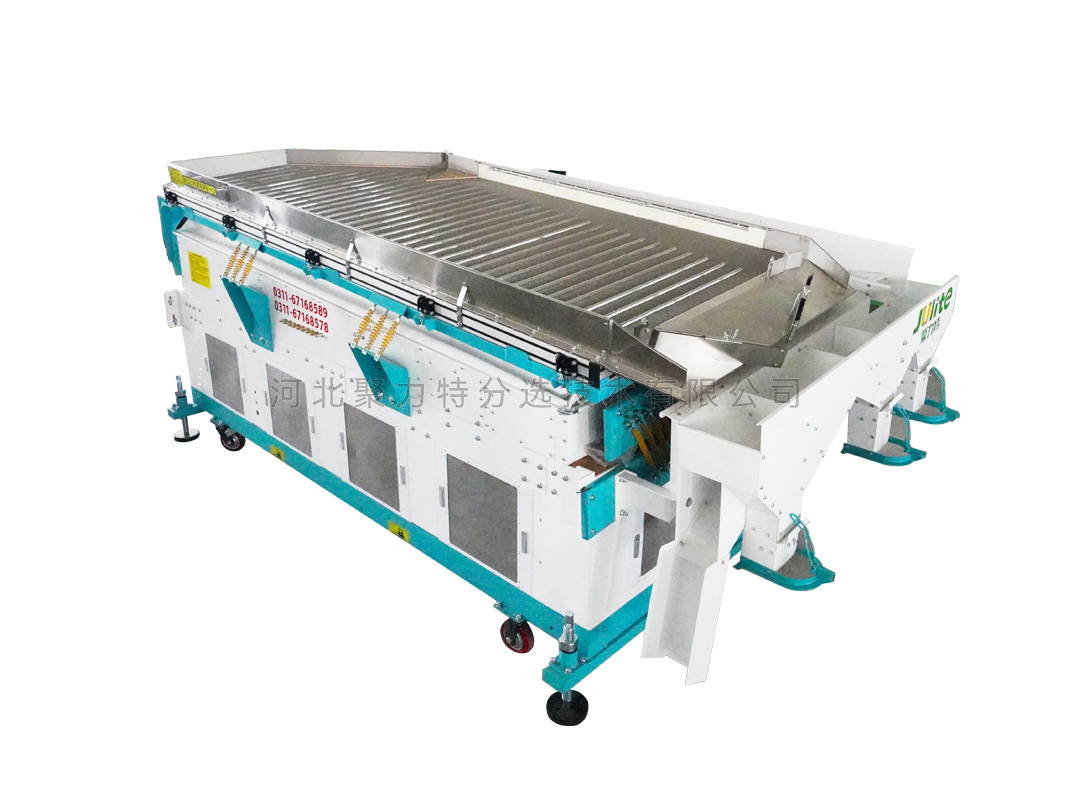 吹式比重精選機是根據(jù)物料在空氣動力和振動摩擦力的雙重作用下產(chǎn)生比重偏析的原理,通過調(diào)整風(fēng)壓、振幅等技術(shù)參數(shù),使比重較大的物料沉到底部貼著篩面由低向高運動;比重較小的物料懸浮在表面由高向低運動,從而達到比重分離的目的。有效去除物料中的秕籽、芽籽、蟲蛀粒、霉變粒、黑粉病粒等比重較輕的雜質(zhì);側(cè)面增加成品側(cè)出糧功能,增大產(chǎn)量;同時比重精選機振動臺面上部設(shè)有一個去石傾角,能將物料中的石子分離出來。