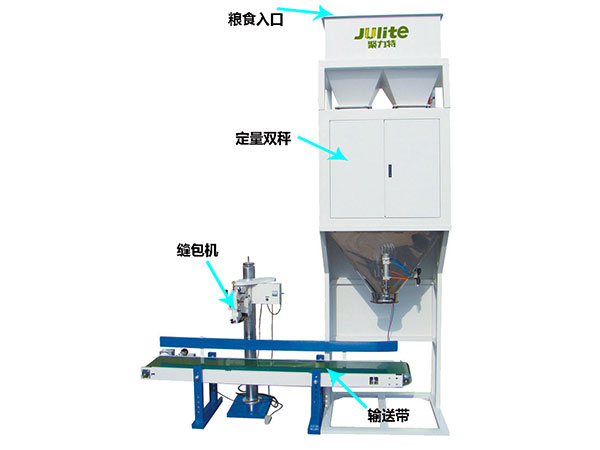 設(shè)定包裝范圍后,物料由給料機(jī)構(gòu)加入稱量斗,控制器收到傳感器的重量信號(hào)后,按預(yù)先設(shè)定的程序值進(jìn)行控制,開啟加料門進(jìn)行給料;當(dāng)達(dá)到設(shè)定的范圍,給料機(jī)構(gòu)停止給料,開始另一個(gè)秤體的給料。自動(dòng)振袋后,觸動(dòng)行程開關(guān),物料袋自動(dòng)松開落入輸送帶上,被送到縫包機(jī)完成縫包。