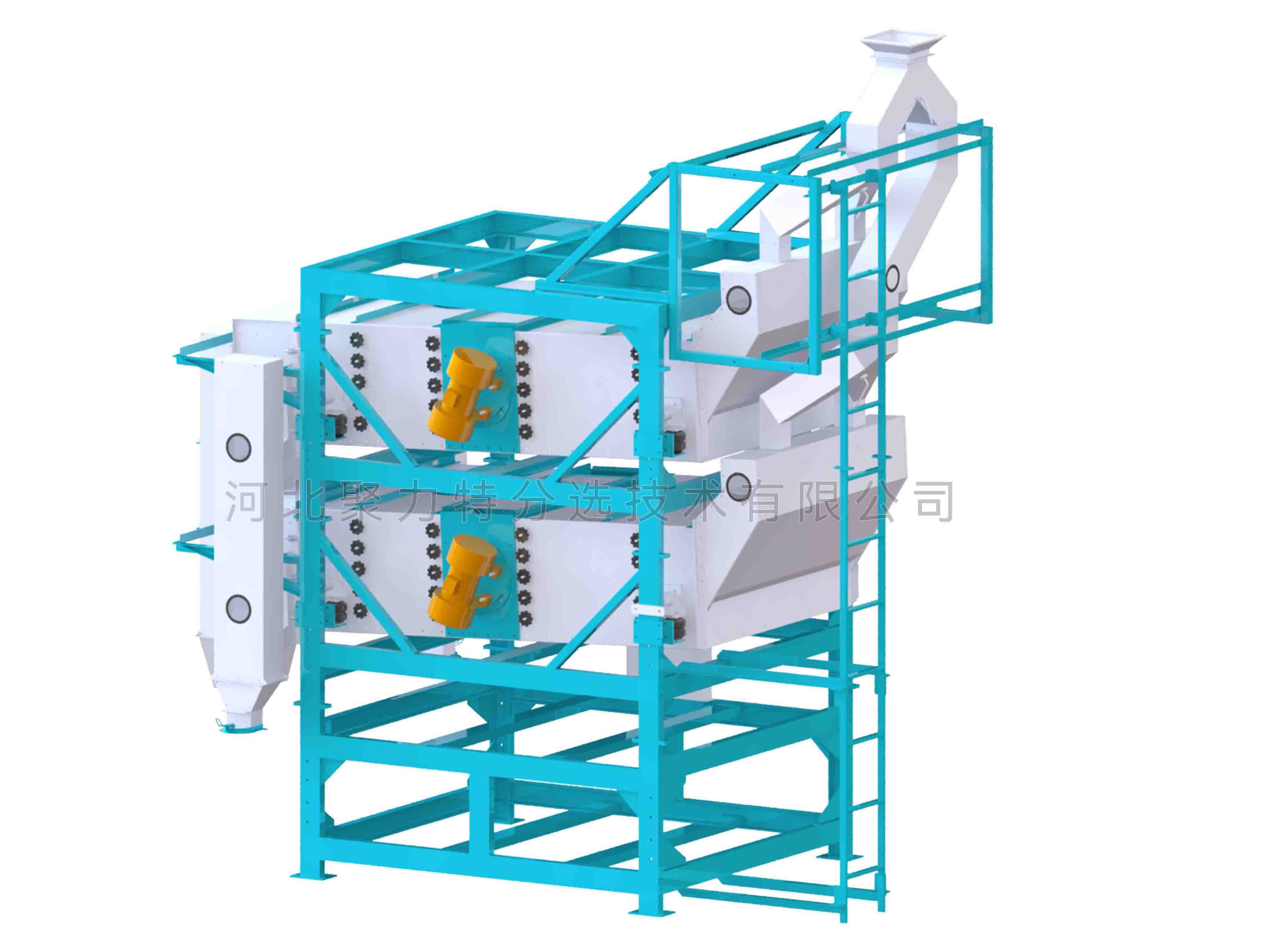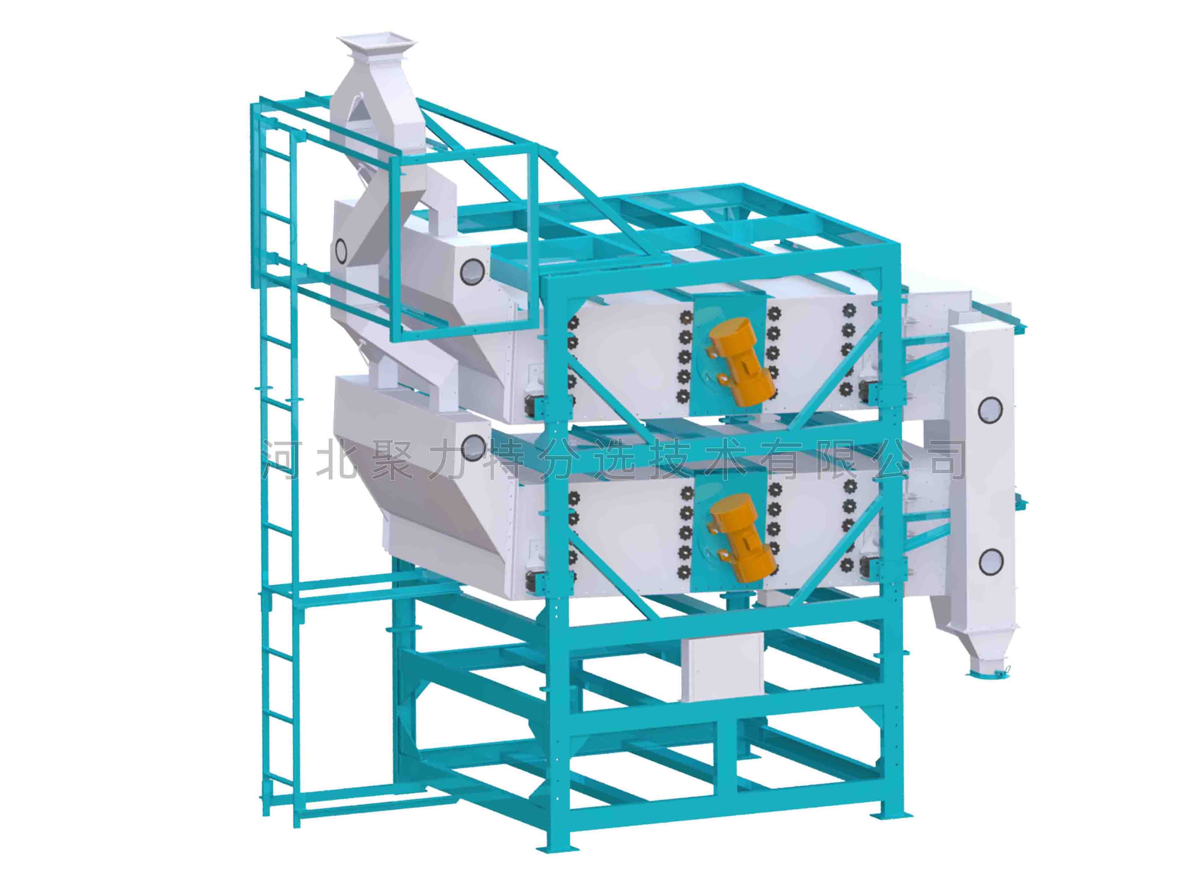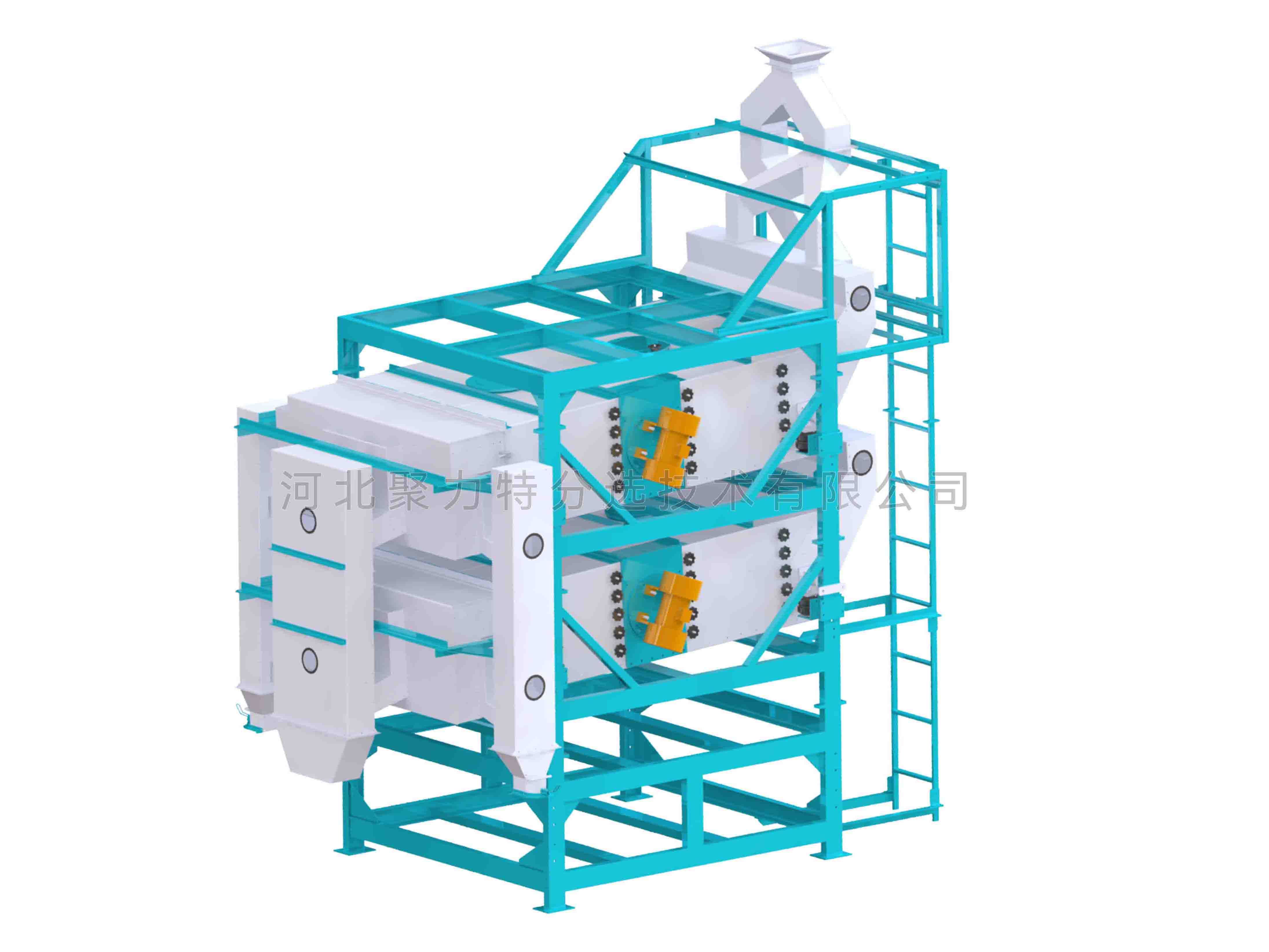 5XFJ-20AS 振動(dòng)分級(jí)篩物料經(jīng)過三通分流至上下兩個(gè)篩箱,進(jìn)入篩箱后通過分料裝置將糧食再次分為兩份,在一個(gè)大篩箱中的兩個(gè)小篩箱內(nèi)同時(shí)加工,一臺(tái)設(shè)備等同于原來4臺(tái)設(shè)備,使產(chǎn)量和效率是原來的3一4倍.