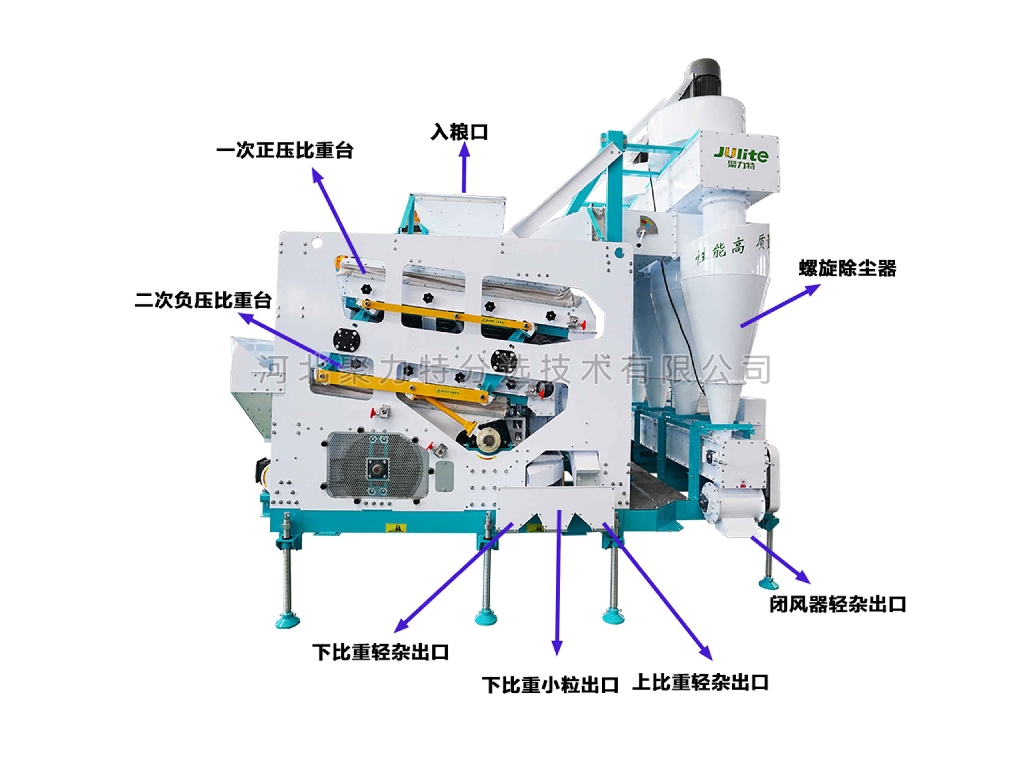 物料通過輸送設備經喂入斗進入第一道負壓比重臺,通過風選去除物料中的粉塵、糠殼等輕雜質,輕雜經風道、螺旋除塵器,由閉風器排出收集;通過比重選有效去除物料中的秸稈、軸塊等比重較輕的雜質。后物料通過導糧機構進入第二道正壓比重臺,通過調整風量、擋板位置等進行比重加工,有效去除物料中的碎粒、秕籽、芽粒、蟲蛀粒、霉變粒等雜質。最終成品從比重臺高處排出。