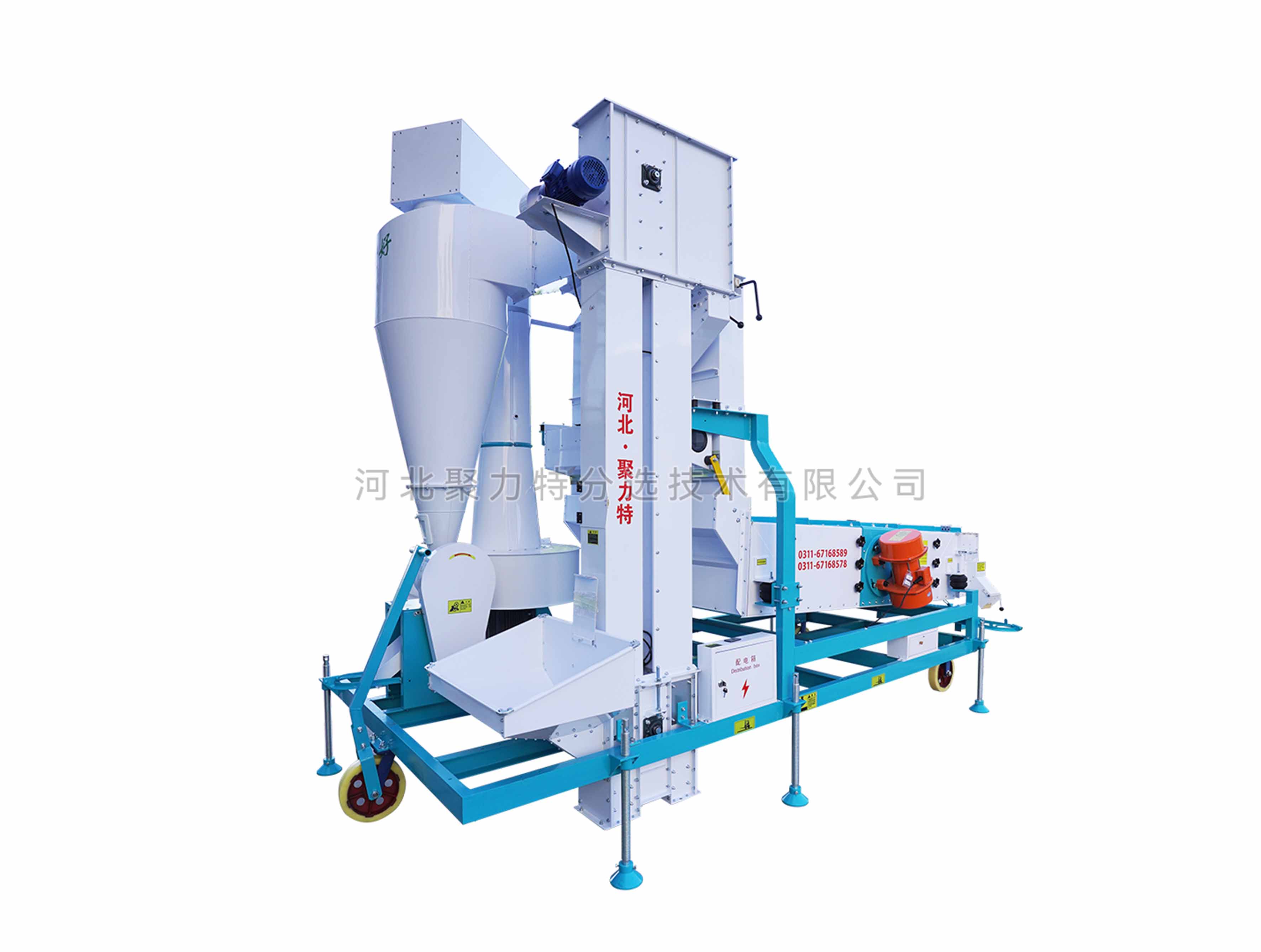 物料通過提升機進入散糧箱,散糧均勻后進入立式空氣篩,物料在風力的作用下分離出輕雜質,經旋風除塵器過濾后,由閉風器排出。物料進入振動篩,根據物料的外形尺寸來調整不同規(guī)格的精密沖孔篩片,去除大雜和小雜同時通過增減篩片的層數將成品分成大粒和中小粒。