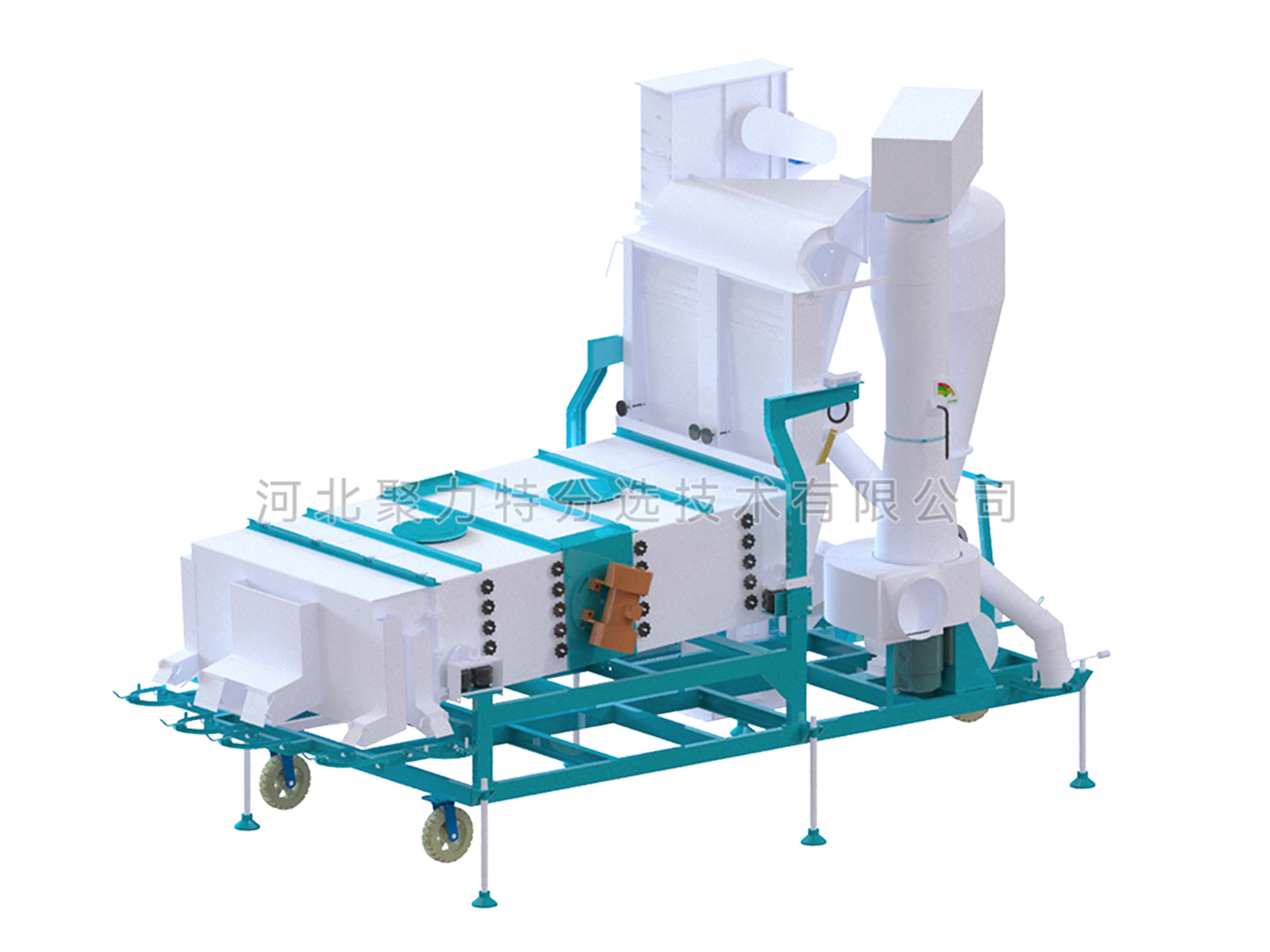 物料通過提升機(jī)進(jìn)入散糧箱,散糧均勻后進(jìn)入立式空氣篩,物料在風(fēng)力的作用下分離出輕雜質(zhì),經(jīng)旋風(fēng)除塵器過濾后,由閉風(fēng)器排出。物料進(jìn)入振動(dòng)篩,根據(jù)物料的外形尺寸來調(diào)整不同規(guī)格的精密沖孔篩片,去除大雜和小雜同時(shí)通過增減篩片的層數(shù)將成品分成大粒和中小粒。
